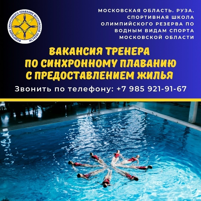 СШОР по водным видам спорта г. Руза ищет тренера по синхронному плаванию. Важное требование: высшее или среднее профессиональное образование в области физической культуры и спорта или педагогики с направленностью «физическая культура»