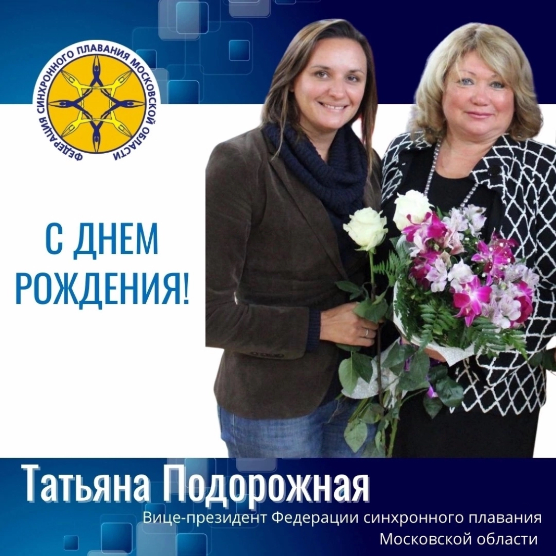 Уважаемая Татьяна Геннадьевна! От лица Федерации синхронного плавания Московской области и всего коллектива хотим Вас от всей души поздравить с юбилеем!